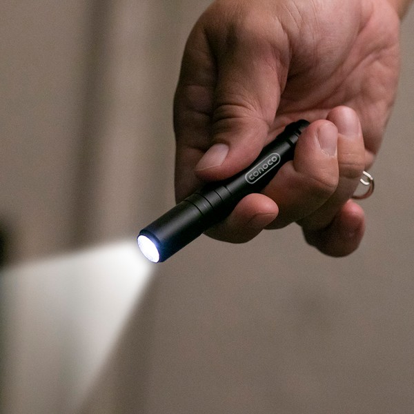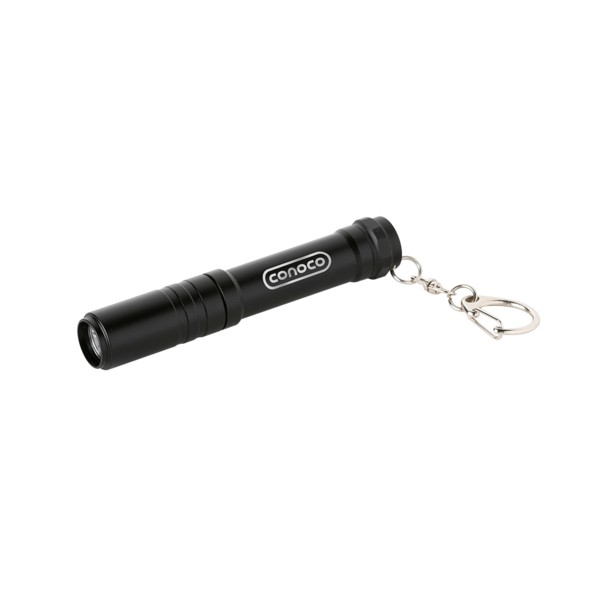 Ultra-bright LED flashlight keychain. Aircraft grade aluminum housing with reduced rolling design; 75 lumen LED; twist head for on/off; requires 1 AAA battery (included). 3.5625″ D x 0.625″ W