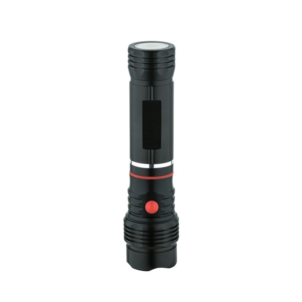 Multi-function aluminum alloy COB flashlight with sleek aluminum casing and red accents. One button on/off control and magnetic bottom for hands-free illumination. Use the 100-lumen front light or slide open the body to reveal a 260-lumen body light. 10x brighter than standard flashlights! Requires 4 AAA batteries (included). 6.6875″ D