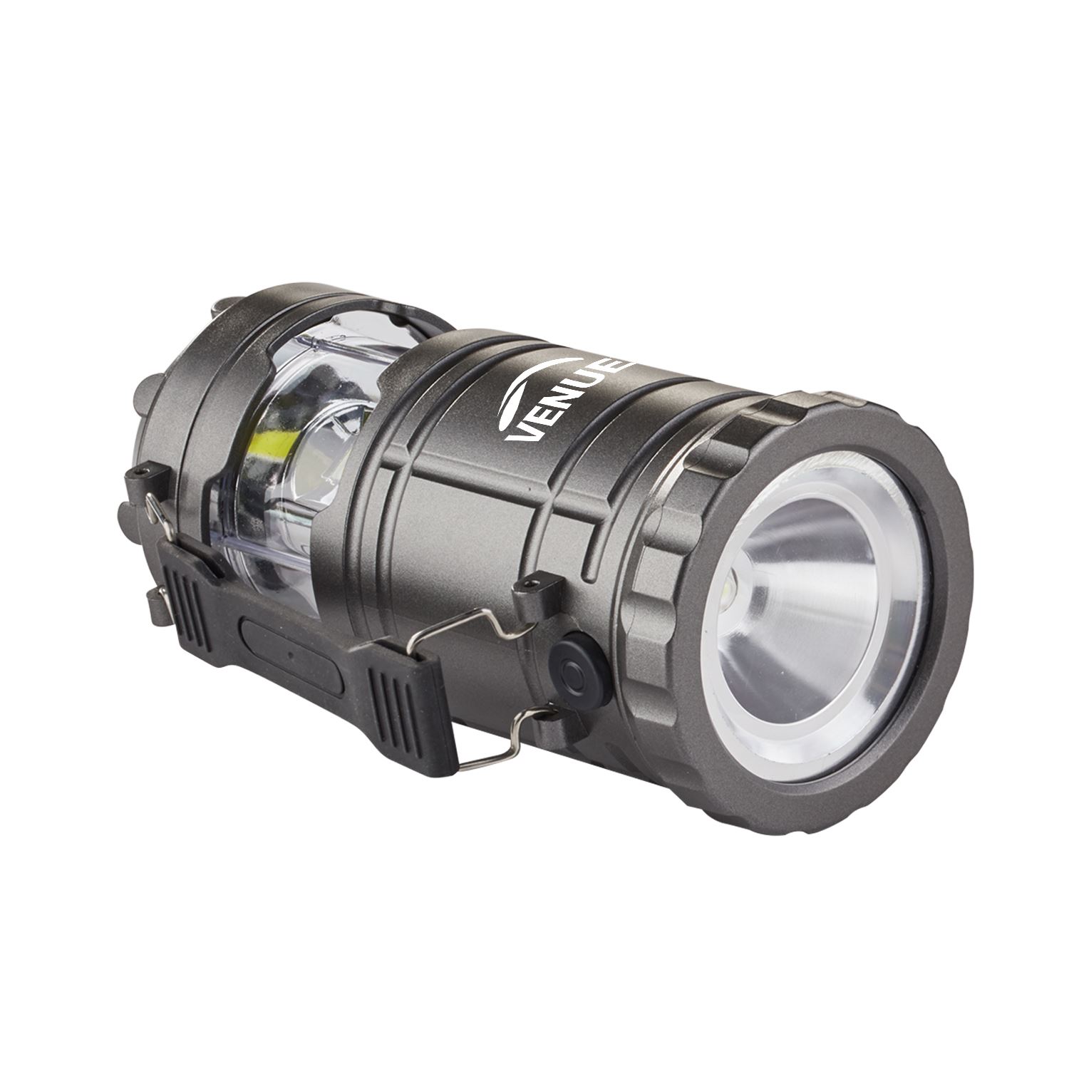 4 1/2″ high when closed. 6 1/4″ when open. This compact collapsible lantern has a powerful flashlight built into the bottom, giving the option of area lighting or directional lighting. Features a rubberized carry handle. 180 Lumens. Comes with 3 “AAA” batteries. Pad print 1-2 colors. (Price includes 1 color, upcharges apply for second color). Boxed. 4.5″ H