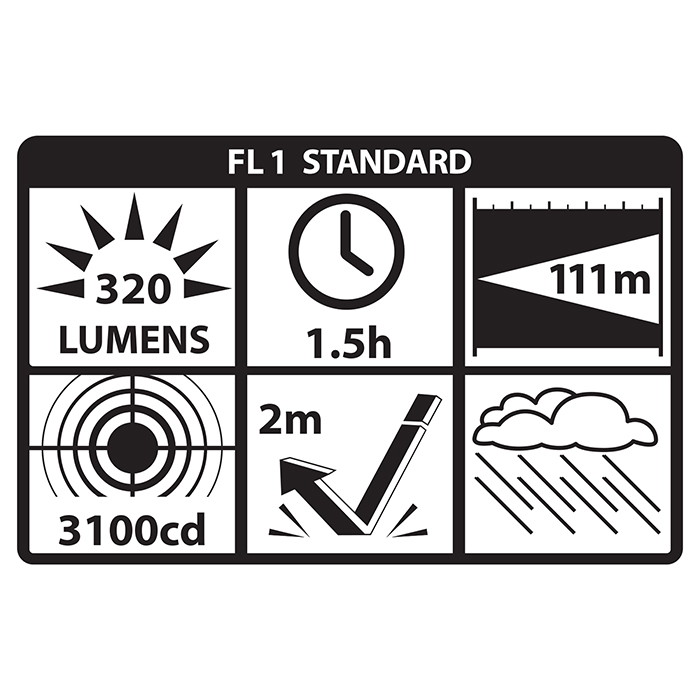 Output: 320 lumens Limited Lifetime Warranty Packaged in a 1000D Water Repellent bag (9.75″H x 4.5″W) IP-X7 Waterproof Includes removable pocket clip, 2 USB charging cord, 1 rechargeable lithium-ion battery and 1000D Water Repellent bag Serialized for personal identification Single body switch with momentary or constant-on modes Aircraft-grade 6061-T6 Aluminum housing, bezel and tail-cap with Type III hard anodized finish Certifications: CE, BC, Meets requirements of NFPA-1971-8.6 (2013) Bulb. 4.5″ D x 1.75″ W x 1.25″ H